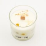Sviečka je vyrobená z prírodného sójového vosku a poskytuje čisté, stabilné horenie vhodné na každodenné používanie. Sušené botanické prvky vsadené do vosku dodávajú nenápadný vizuálny detail, ktorý zachováva prirodzený a decentný charakter dizajnu. Priehľadný sklenený pohár spolu so značkovým balením vytvárajú upravený, súčasný vzhľad, ktorý sa dobre uplatní v rôznych typoch predajných prostredí.